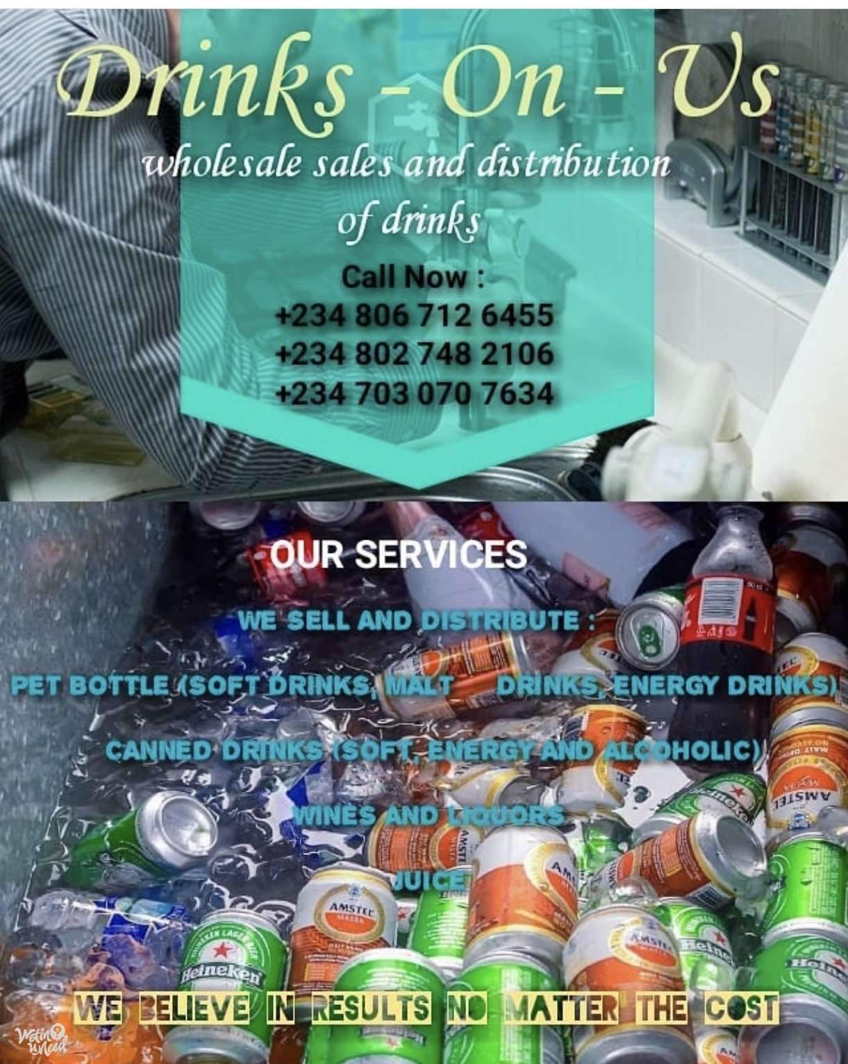 Drinksonuspro takes the stress off you when it comes to finding drinks for home us or events. We help you source unadulterated drinks at the best prices in the market. We can handle your events by suppling your drinks and advising you on the quantity of drinks you need so you don't run out while your party is in full swing. We are trust worthy and we deliver...