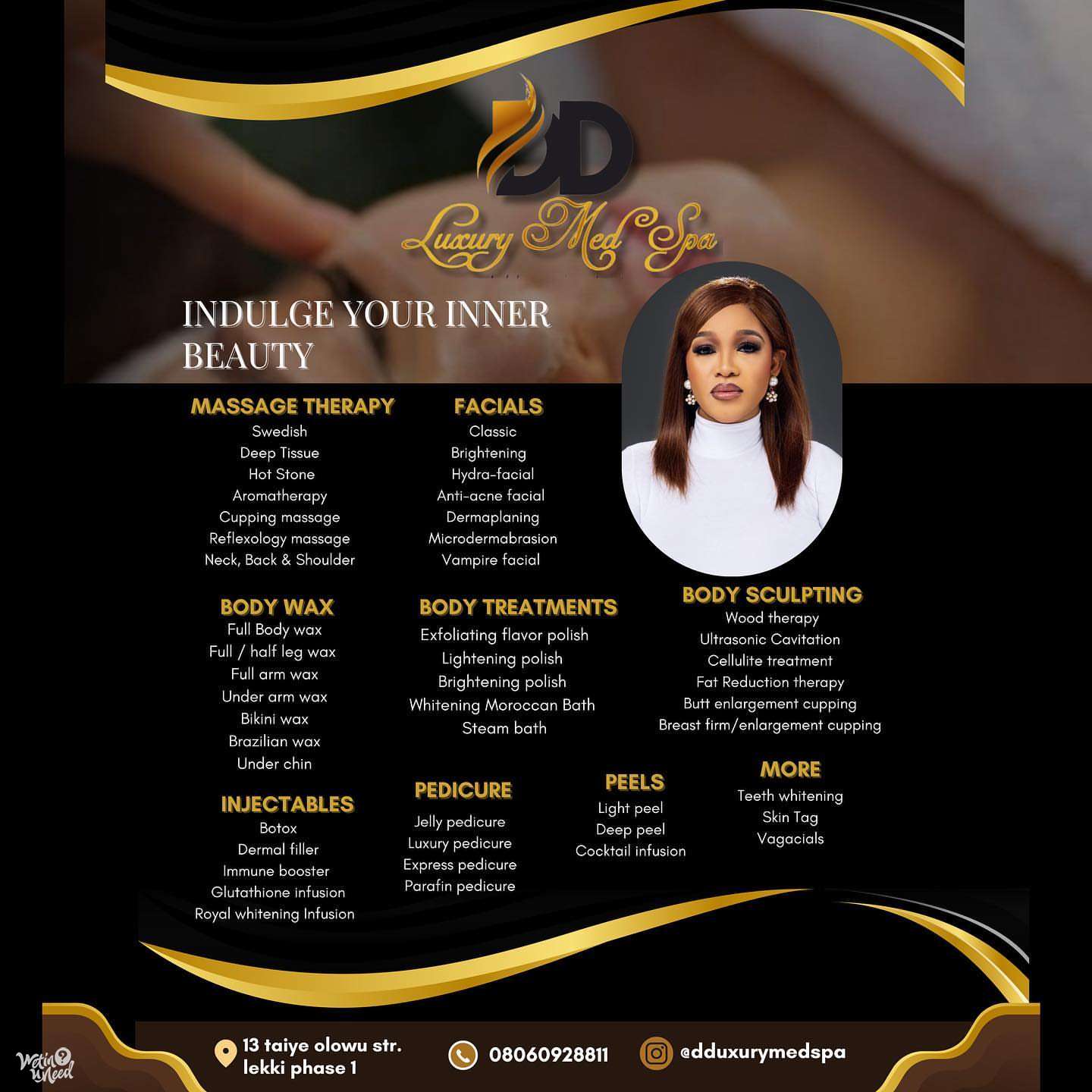 DD LUXURY MED SPA is a full-service wellness and beauty spa offering expert massages, luxury facials, professional waxing (soft, hard & sugar), body scrubs, makeup services, teeth whitening, injectables & fillers, skin tag removal, nails, and grooming treatments — all delivered in a clean, relaxing, and client-focused environment.