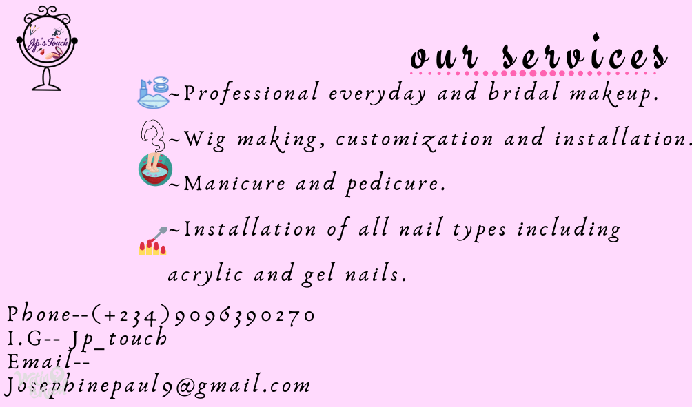We are involved with anything beauty. Professional bridal makeup, photography makeup, and others. Frontals and other wig processes is our calling. Manicure and pedicure is also what we professionalize in. The smile on our clients face is our priority. Jp's touch is one touch with a lot of difference.