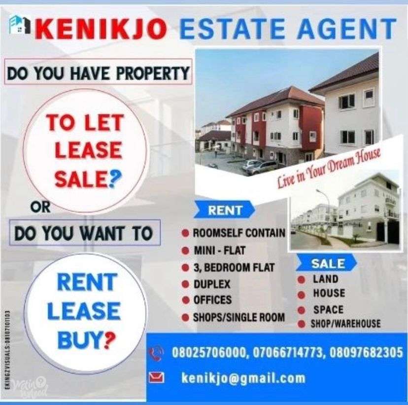 WELCOME TO KENIKJO RNTERPRISE ESTATE AGENT AND GENERAL CONTRACTOR CONTACT MY SERVICE ESTSTE AGENT FURNITURE MAKER AND PAINING WORK MY SERVICES WE GIVE YOU WELDON JOB MY WACTH WORLD IS TRUTE AND FAITHFULLNESS AND I PROMISE YOU THE BEST BY GRASE OF GOD THANKS AND GOD BLESS YOU AS YOU CONTACT MY SERVICES REMAIN BLESSED 07066714773/08025706000
