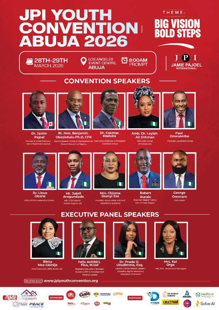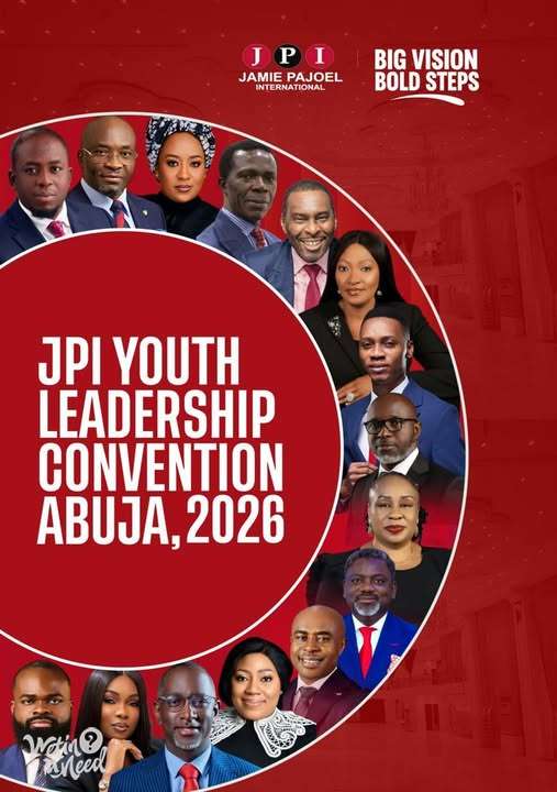 Join over 3000 delegates from 10 Countries at the 6th edition of the JPI Youth Leadership Convention 2026 in the city of Abuja, Nigeria Sponsorship An organization is sponsoring 50% of the registration fee for 200 participants. That means you pay ₦10,000 instead of ₦20,000. Offer closes February 28, 2026 To apply for the sponsorship, send the following details to: 0907 577 4158 Full Name Phone Number Email Address Secure your slot before the deadline Register here: www.jpiyouthconvention.org.
