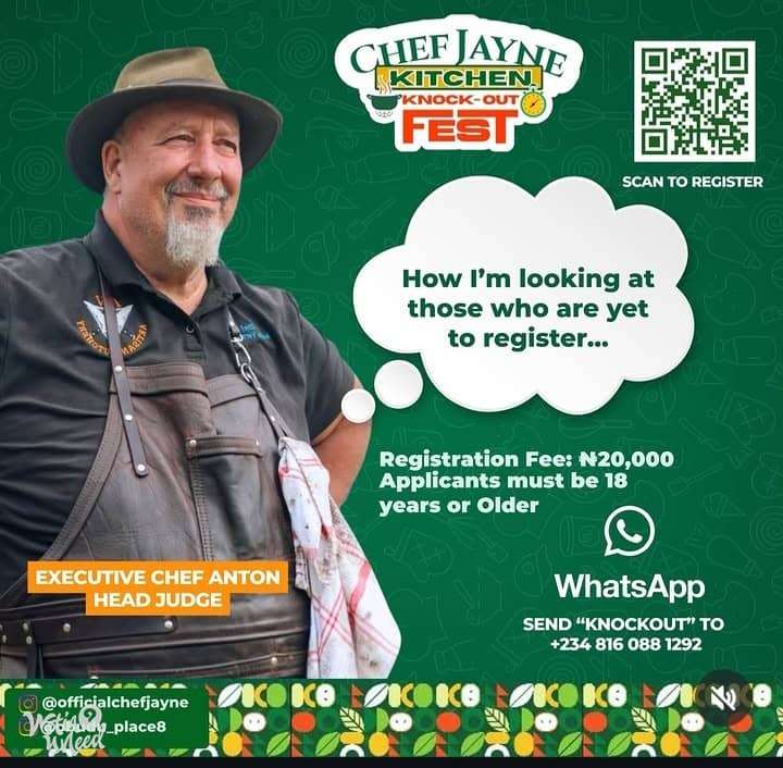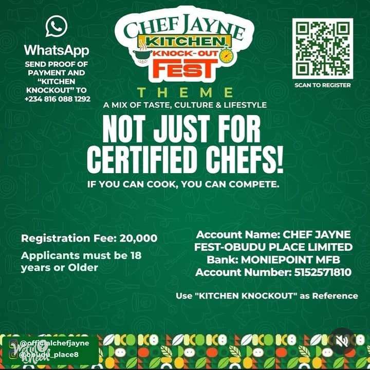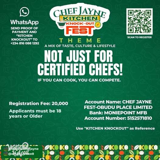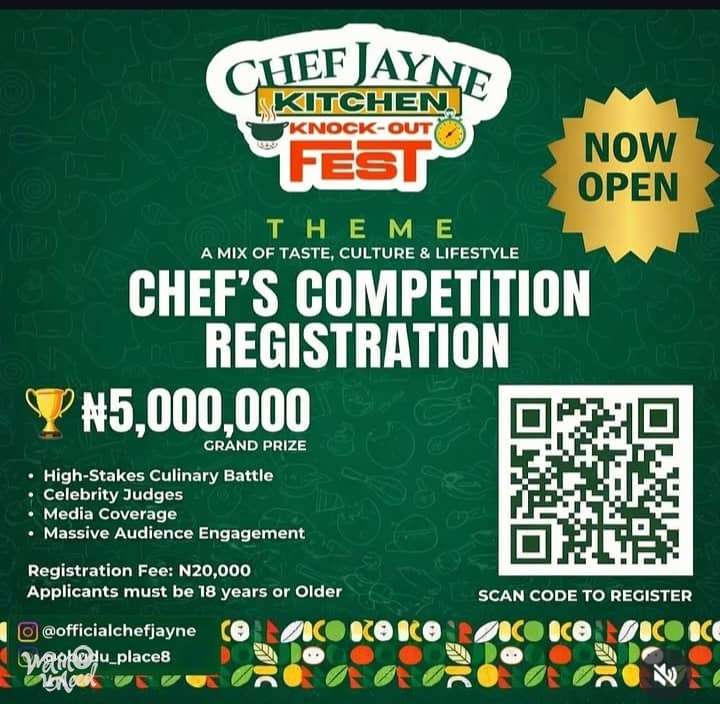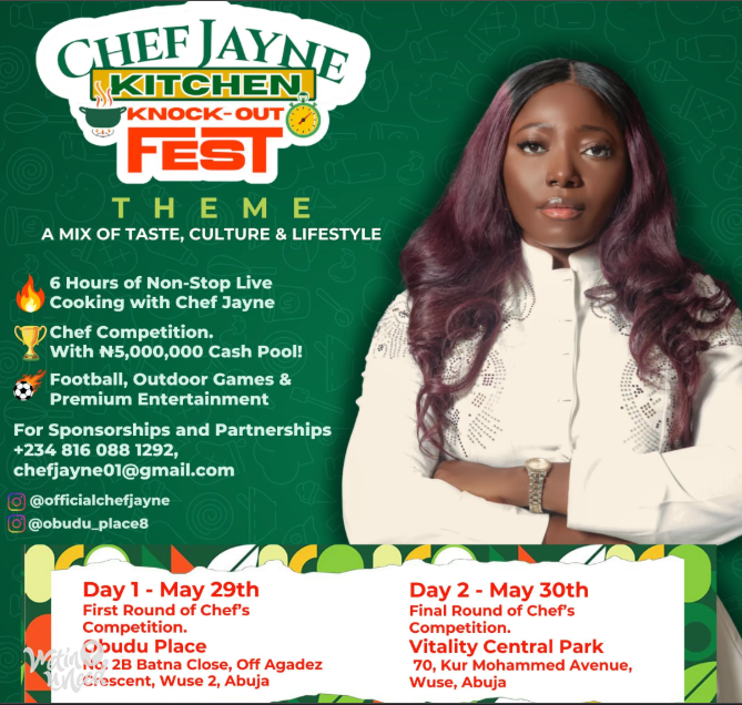 Chef Jayne Kitchen Knockout Fest 2026 is a two-day culinary and lifestyle experience designed to bring together food, culture, entertainment, and in one unforgettable event. Day 1 – May 29th, 2026 The journey begins with the First Round of the Chef Competition, where talented chefs battle it out live for a spot in the finals. Venue: Obudu Place, No 2b Batna Close Off Agadez Crescent, Wuse 2, Abuja. Day 2 – May 30th, 2026 Venue: Vitality Central Park, 70, Kur Mohammed Way, Wuse, Abuja. .