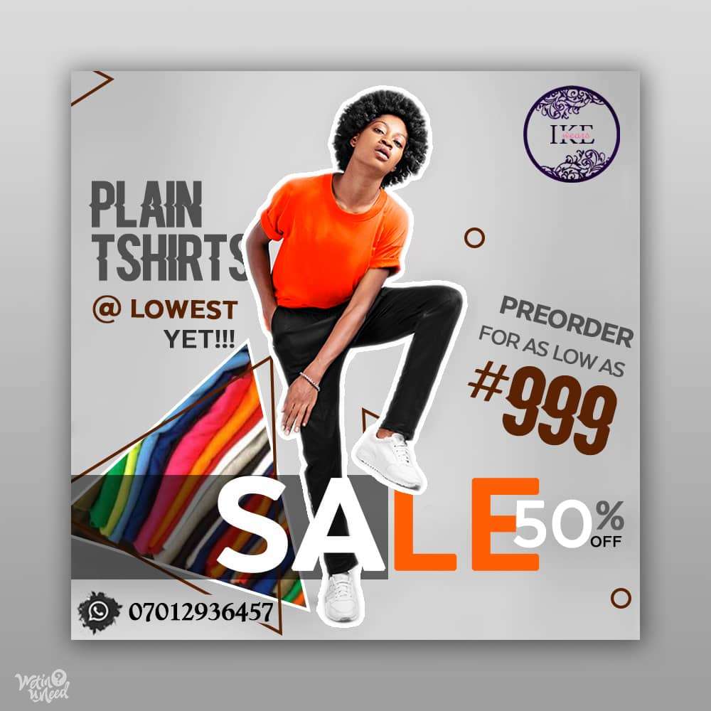 Dear Customer, You are always the first consideration in all our business dealing and we want to be in business for as long as we can meet your needs. It is in the light of this that we bring this mouth watering and pocket friendly deal. Pre-order your *plain Tees* for as low as #999 per Tee. Tees of standard quality material, perhaps the lowest price you can get for such a quality. To place an order, send a message on WhatsApp (07012936457) Or call 08177202116.