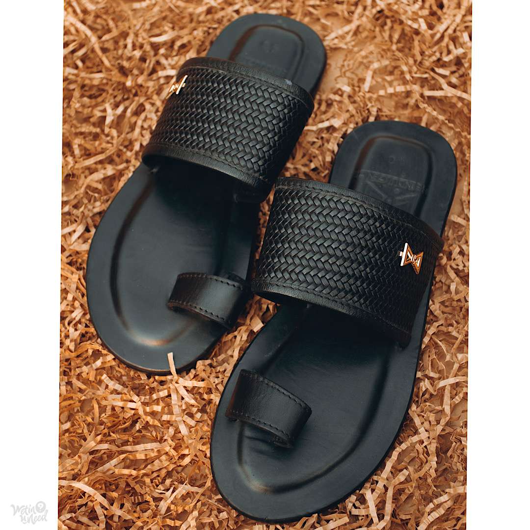 Mens Leather Basket weave Slippers – black – ( ADEKUNLE )